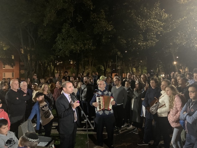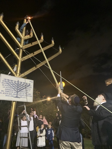 Después de disfrutar de deliciosos sufganiot y latkes, todos al parque para encender la janukiá gigante, donde los asistentes cantaron canciones alusivas a la fiesta y balaron animadamente. El Shamash fue encendido por el Embajador de Israel en Colombia, S.E. Christian Cantor y la primera vela por Joe Faskha, acompañados los dos por el Rabino Yehoshúa Rosenfeld. Las escenas estuvieron captadas por el noticiero Red+ Noticias que conduce nuestro comunitario Giovanny Celis.