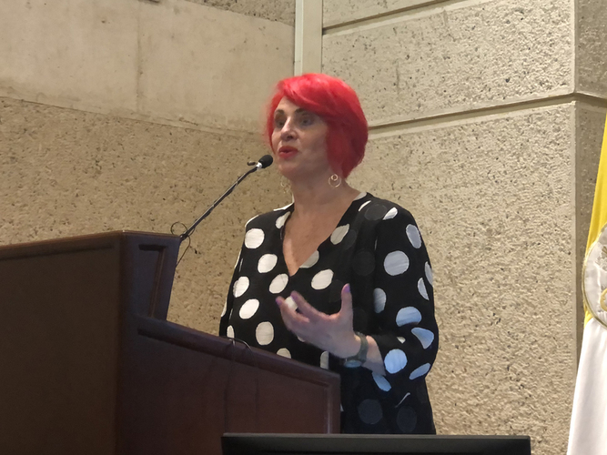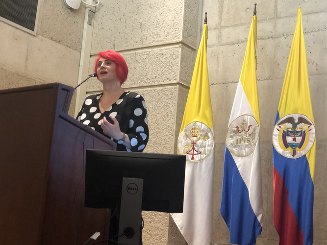 Finalmente, como la cereza del pastel, la profesora Dra. Adelaida Sourdiz, Doctora en Ciencias jurídicas e historiadora de la pontificia Universidad Javeriana, Máster en investigación Social e interdisciplinaria de la Universidad Distrital Francisco José de Caldas, e investigadora, inició su cátedra magistral relatando cómo llegó a la investigación sobre los judíos en Colombia. Propuso una división de la historia judía en tres etapas, recalcando que la historia de la presencia judía data de muchos años atrás, desde el siglo XV, la segunda etapa en la época de simón Bolívar y finalmente con la creación de las comunidades a principios del siglo XX. Relató sobre el aporte de personajes y comunidades judías al país, en una profunda e interesante conferencia que duró alrededor de 40 minutos, durante los cuales describió muy brevemente cada etapa que propuso.