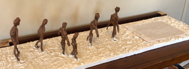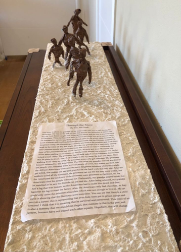 Después de ser liberado, mi abuelo tenía una pierna rota así que los americanos lo tuvieron que emborrachar para martillar su pierna y arreglar el hueso. Además, los americanos solo tenían chocolate, así que solo podían darle chocolate a los prisioneros que no era suficiente para vivir. Mi pieza de arte representa que incluso niños fueron enviados a campos de prisioneros y torturados. Creo que es increíble que él haya sobrevivido y perseverado. Esta pieza de arte también es una memoria para que no olvidemos, esa memoria es que en el pasado y presente los humanos no se han tratado con igualdad los unos a los otros.