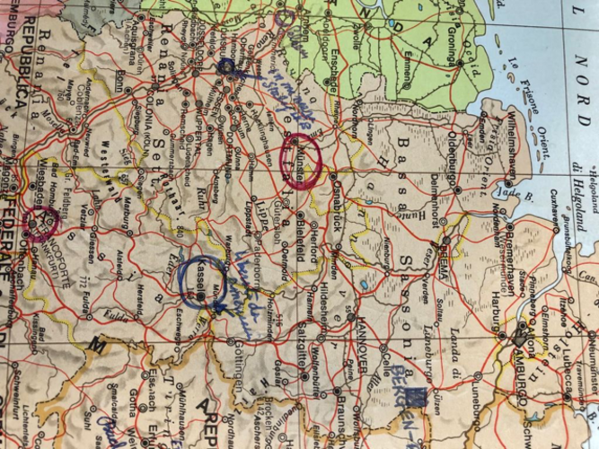 ND: Hace tres años, cuando Ilán Goldschmidt Meunier, el nieto del Rav Alfredo quien vive en California, tenía 10 años, su colegio les solicitó realizar un trabajo artístico que represente algo de la familia. A Ilán, su madre le había relatado la historia de su abuelo, quien no siendo judío se había unido durante la Segunda Guerra Mundial a grupos de partisanos, quienes luchaban contra los nazis. Ilán investigó con otros familiares y de ahí salió ésta conmovedora historia que ha traducido al español nuestra subdirectora Vivianne Tesone. El gráfico que se ve, elaborado por Ilán, es la escena de los hombres de la resistencia no judíos, entre ellos su abuelo, quienes habían sido capturados por los nazis y los conducían desnudos en la nieve de un campo de concentración a otro. El mapa marca los campos de concentración donde estuvo su abuelo.