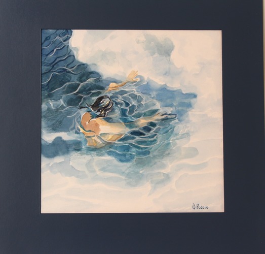 El agua, la inmersión y la reflexión interior son reflejadas co el uso del color y la perspectiva en las diferentes piezas. El agua fluye y este movimiento es un tema recurrente en la obra de Possin. Una serie de pinturas fusionan la mirada con el agua y reflexión sobre ese espacio de meditación interna que hace parte del ritual. “Somos 90% agua, debemos fluir, no estancarnos, estar siempre en movimiento para crecer, para crear, para multiplicar nuestras relaciones. Salimos del agua hacia el mundo,” dice la artista.