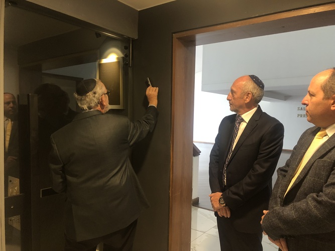 Durante la inauguración, ambientada con un músico de notas suaves y elegantes, El Gran Rabino Alfredo Goldschmidt colocó la Mezuzá en la puerta de entrada del museo localizada en el primer piso, junto con el Arquitecto Korn y el presidente Núdelman.
