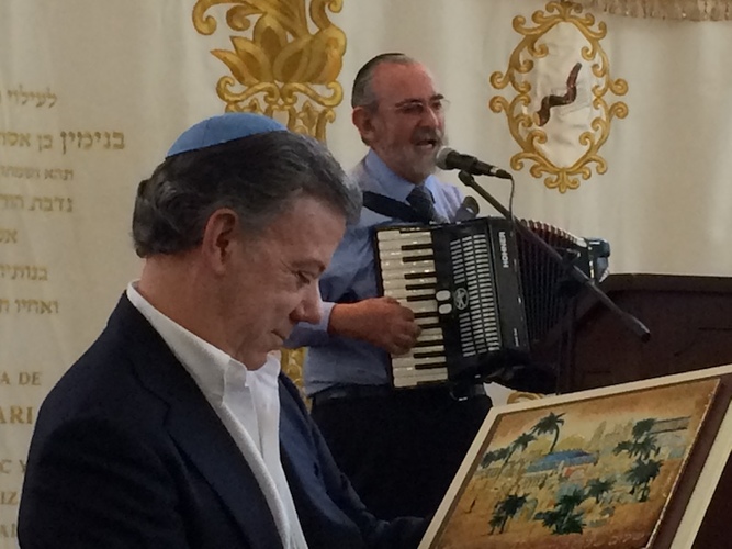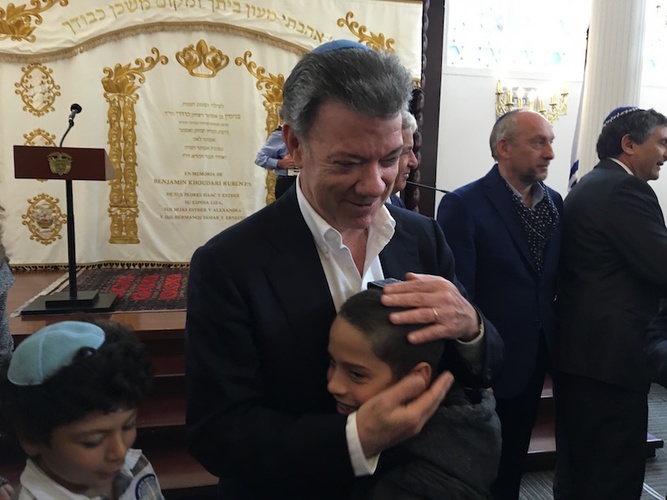 El pasado domingo 2 de octubre a las 11 de la mañana en la elegante sinagoga Maguen Ovadia de la Comunidad Hebrea Sefaradí, la comunidad judía tuvo el honor de recibir al Sr. Presidente de la República de Colombia, Dr. Juan Manuel Santos. Organizado por el Sr. Jean Claude Bessudo, junto con la Confederación de Comunidades Judías de Colombia (CCJC).