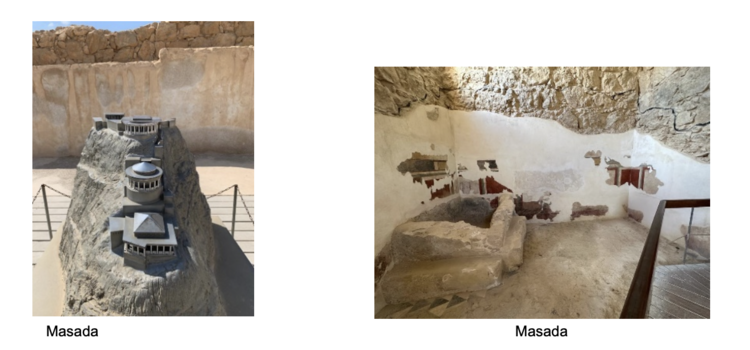 Al siguiente día visitamos Masada, situada a 400 metros sobre el nivel del Mar Muerto donde nos trasportamos a la época de Herodes quien fue el que la reconstruyó. Este lugar data del siglo II a.C, Herodes el Grande, rey de Judea entre los años 37 y 4 a.C., la habilitó como una ciudadela, construyendo una muralla, una torre de defensa, almacenes, cisternas, cuarteles, arsenales y residencias para los miembros de la familia real. Y en los años 60 D.C. se suceden los eventos de los rebeldes dirigidos por Eleazar Ben Jair, quienes se enfrentaron e hicieron resistencia al imperio y al sitio realizado por los romanos.