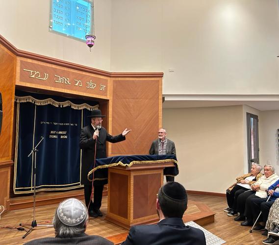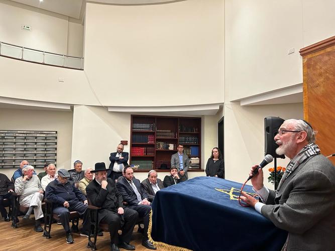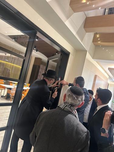 Nos dirigió unas palabra y luego procedió a colocar la Mezuza en la entrada de la sinagoga y en la entrada al comedor "Linda Abadi”.