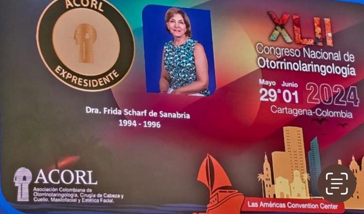 La ACORL (Asociación Colombiana de Otorrinolaringología), rindió un homenaje a la Dra. Frida Scharf de Sanabria, otorgándole una placa en reconocimiento por toda una vida dedicada al progreso de la otorrinolaringología en Colombia y Latinoamérica, en el marco del 42° Congreso Nacional de Otorrinolaringología realizado a fines de mayo y principios de junio de 2024 en Cartagena Colombia.