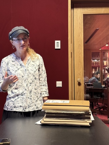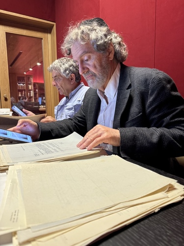 Durante el recorrido, Aliza Moreno nos llevó a conocer diversos espacios de la biblioteca, incluido el área de documentos especiales y el sistema robotizado de almacenamiento. En la sala de lectura de documentos especiales, Aliza nos tenía una sorpresa guardada: documentos históricos ORIGINALES, tales como actas del Centro Israelita de Bogotá de 1944, archivos de la Comunidad Hebrea Sefaradí de la década de 1960, correspondencia del Colegio Colombo Hebreo y documentos de la Unión Federal Hebrea de Cali.