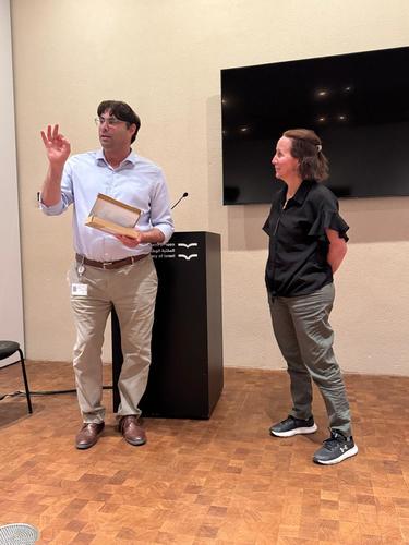 La jornada inició con una visita guiada por el nuevo edificio de la Biblioteca Nacional de Israel, cuya inauguración, prevista para el 23 de octubre de 2023, fue pospuesta y limitada debido a los acontecimientos del 7 de octubre. El edificio, situado frente al Knesset, se destaca tanto por su arquitectura exterior como su belleza y contenido interior.