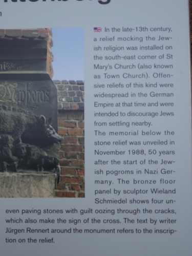 Hoy en día hay una placa explicativa y conmemorativa a las millones de víctimas del antisemitismo que el Judensau inspiró. Pero el Judensau sigué ahí, en palco de primera, a pesar de algunas mociones en change.org para retirarlo, y a pesar de la humilde marcha semanal de unas monjas que piden su traslado a un museo; los habitantes de Wittenberg prefieren dejarlo ahí como parte de la historia del pueblo. En este año, que se celebran 500 de la reforma Luterana, el Judensau sigue presente como testimonio latente del milenario antisemitismo cristiano que aún lucha por terminar de pasar esa página vergonzosa de su historia.