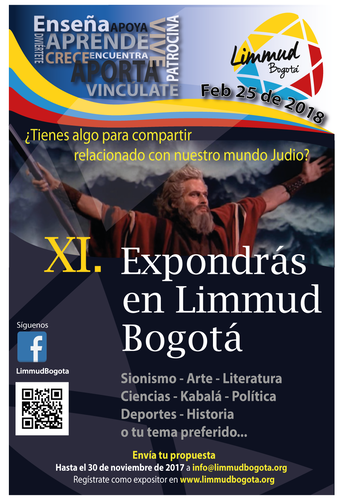 Para quienes ya han participado de este evento en sus versiones 2016 y 2017, y para quienes aún no se han vinculado, la cita será en Febrero de 2018 para el próximo Limmud en Bogotá. Sea este el momento para invitar a todos los interesados en participar como expositores, a someter su propuesta para una charla de 50 minutos enviando una breve descripción del tema a tratar y una resumida biografía a info@limmudbogota.org Para todos quienes quieran asistir, los invito a curiosear el contenido de las dos primeras versiones y la filosofía de este proyecto visitando www.limmudbogota.org