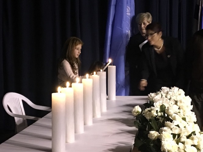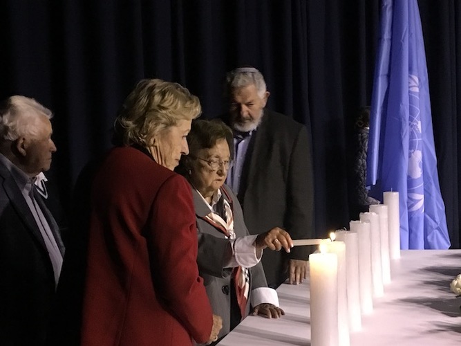 Los sobrevivientes asistentes acompañados de familiares, descendientes de justos entre las naciones y personalidades nacionales encendieron seis velas en memoria de los seis millones de judíos que murieron en el holocausto y una séptima vela de la esperanza.