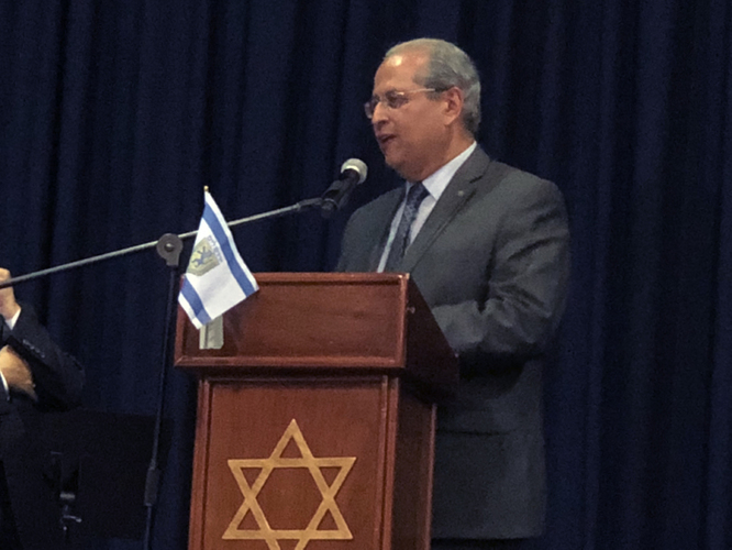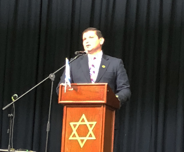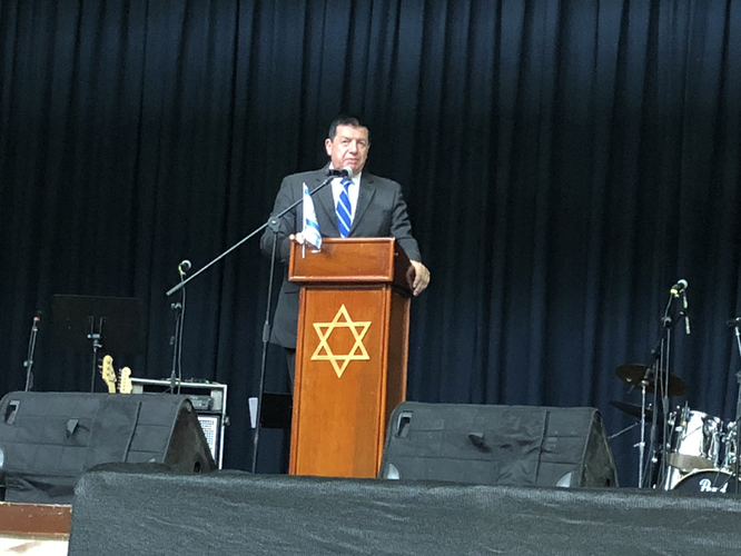 Se inició la ceremonia con las palabras del Senador John Milton Rodríguez1, del partido “Movimiento Colombia Justa y Libre”, pastor de la Iglesia Misión Paz a las Naciones. Puntualizó en datos numéricos sobre los logros de Israel recalcando que Israel es inspiración para Colombia en sus logros, en muchos campos: educación, salud, seguridad, etc. siendo un país tan joven., aclarando que los números nos ayudan a entender la supervivencia del pueblo judío. Habló sobre la lealtad de Colombia hacia Israel que se expresa a través de los corazones, y finaliza con la frase: “los amamos”. Además se pronunció políticamente, dando a conocer su posición contraria frente a la determinación del anterior gobierno que reconoció a Palestina, sin haber antes esperado a que resuelvan de acuerdo a lo pactado en Oslo. Se pronunció de manera segura y fuerte sobre su respaldo a Jerusalem como capital de Israel, momento en el cual el público estalló en aplausos y gritos de alegría.