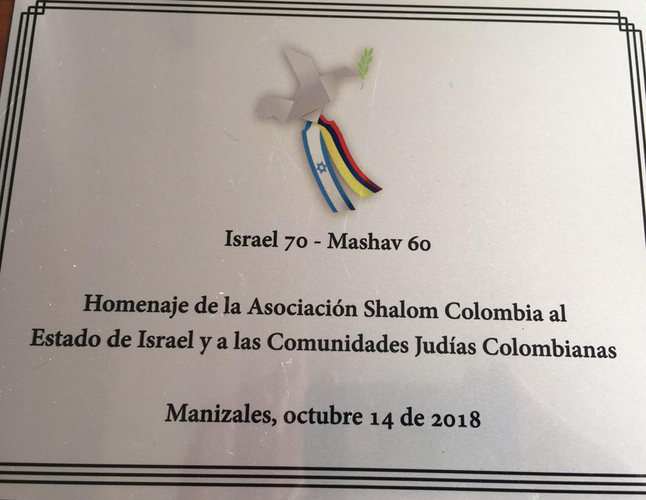 El pasado viernes 2 de noviembre la Asociación Shalom Colombia otorgó un importante reconocimiento al Estado de Israel y a las comunidades judías colombianas a través de le entrega de una placa y un libro, en un sencillo, pero lleno de cariño, homenaje llevado a cabo en el Colegio Colombo Hebreo.