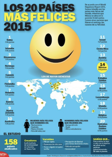 En el índice de felicidad 11 sobre 157 por tercer año consecutivo. Antes de Estados Unidos en el 13, Reino Unido en el 23, Francia en el 32, e Italia en el 50. Con el objetivo de “estudiar los fundamentos científicos para medir y comprender el bienestar subjetivo”, el informe abarca a 157 países por los niveles de felicidad utilizando factores como el producto interno bruto (PIB) per cápita y años saludables de la expectativa de vida. También evalúa “tener a alguien con quien contar en tiempo de angustia” y la ausencia de corrupción en el gobierno y los negocios. Agrega: “Cuando los países persiguen objetivos individuales como único propósito, tales como el desarrollo de la economía en detrimento de los objetivos sociales y medioambientales, los resultados pueden ser muy adversos para el bienestar humano, incluso peligrosos para la supervivencia”.