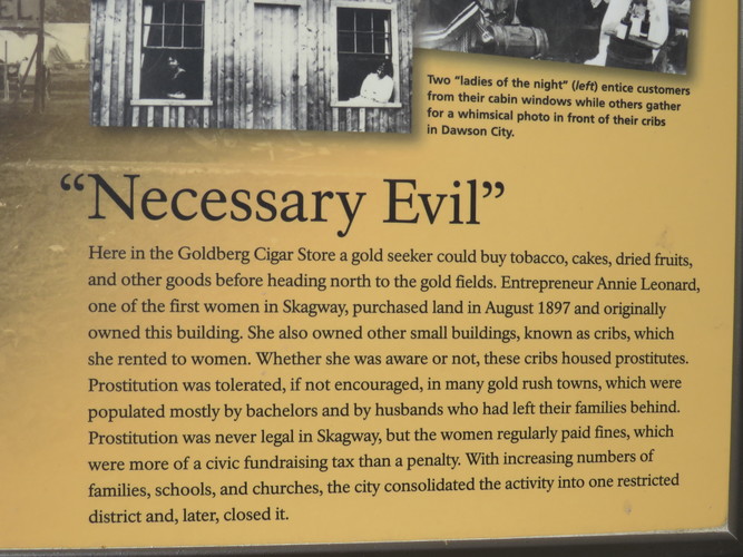 Antes de que el gran estado del extremo del continente pasara a manos americanas, ya habían llegado algunos paisanos, unos persiguiendo el Dorado en Klondike y Nome y otros dedicadas a la caza de pieles. Algunos citadinos colegas montaron hoteles en lugares como Skagway, donde los mercadearon por horas, como en caso del burdel de la señora Goldberg cuya foto (la del burdel) les comparto a continuación.