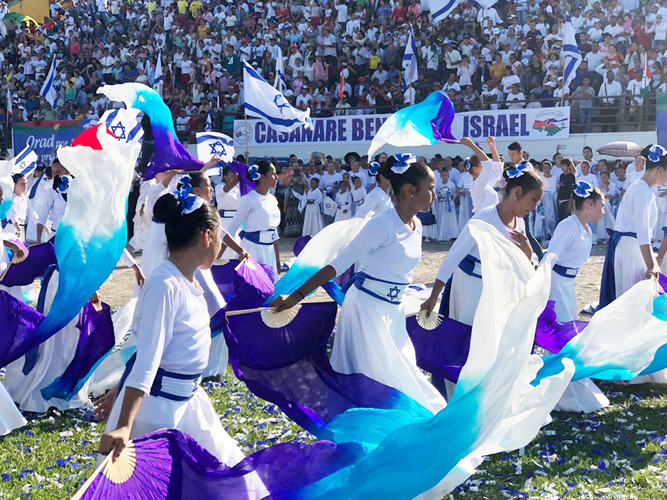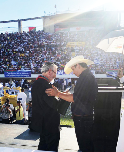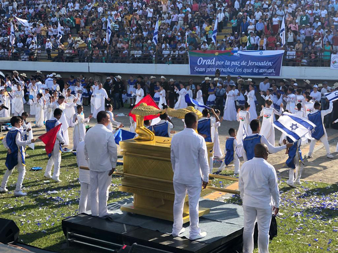 Al invitado de honor, el Rabino Alfredo Goldschmidt, lo recibió una comitiva que lo condujo al estadio donde 20 mil personas le esperaban ansiosamente, batiendo las 15 mil banderas de Israel, cantando y bailando frente a un escenario decorado con objetos que recordaban el Antiguo Testamento. El pastor Eduardo Gómez, entre los presentes, fue entrevistado por la revista Aurora de Israel *1. Estaba el pastor Darío Silva Silva quien fuera uno de los más brillantes periodistas en Colombia y hoy dirigente de una de las iglesias más importantes, “Casa sobre la Roca”, exponiendo su discurso*2: “…la unidad de Israel con el pueblo cristiano es una necesidad no solamente espiritual sino para el mundo una necesidad política y de cualquier naturaleza que uno piense…”. Importante también el brillante discurso del director Ejecutivo del CCJC, Profesor Marcos Peckel, relatando historias y aportes de Casanare a la lucha libertadora y las similitudes con el Estado de Israel.